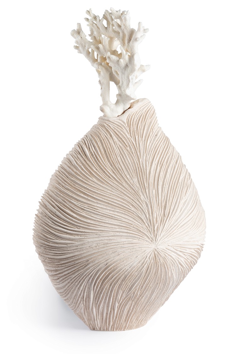 Одна из фантастических ваз серии "Цветы океана " авторства Анны Антадзе-Мамаладзе. Это серия выдуманной флоры и фауны. Она про эмоции, которые мы испытываем, когда наконец-то входим в море, океан. Солнце бьёт в глаза, взрыв мимолетного счастья... Через прищуренные глаза мы видим абрис морских волн, белый свет солнца и брызги от всплесков волн.