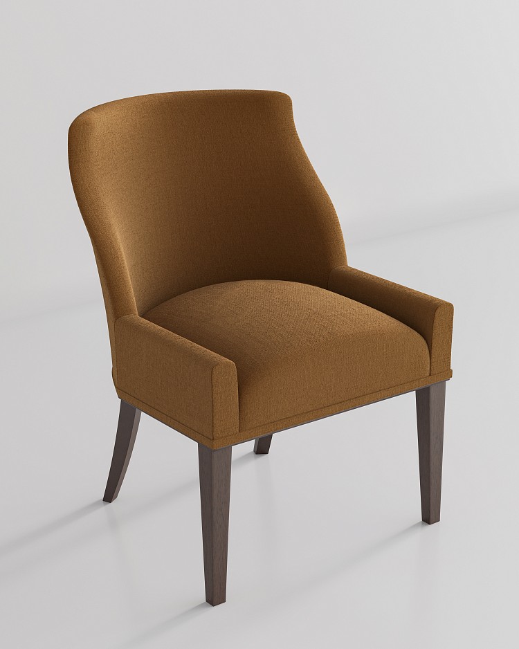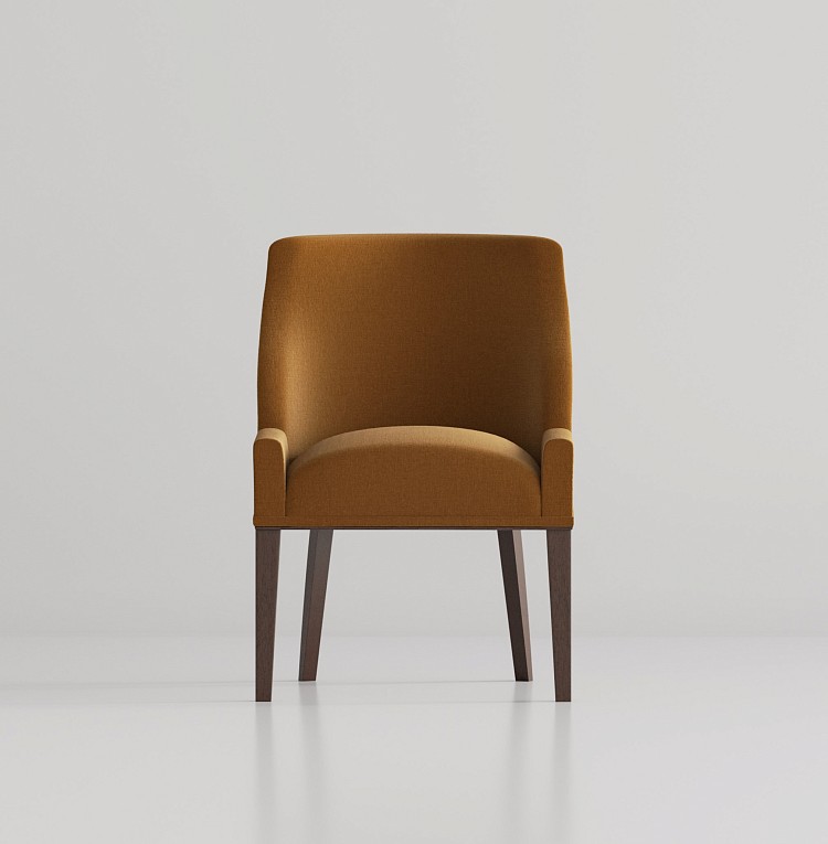 Стул-кресло в текстильной обивке, с высокой спинкой, обеспечивающей поддержку и комфорт. Силуэт спинки детально проработан, его тонкий изгиб напоминает о классических моделях. Форма слегка напоминает английские wing-chair – идеальные кресла для долгих бесед.