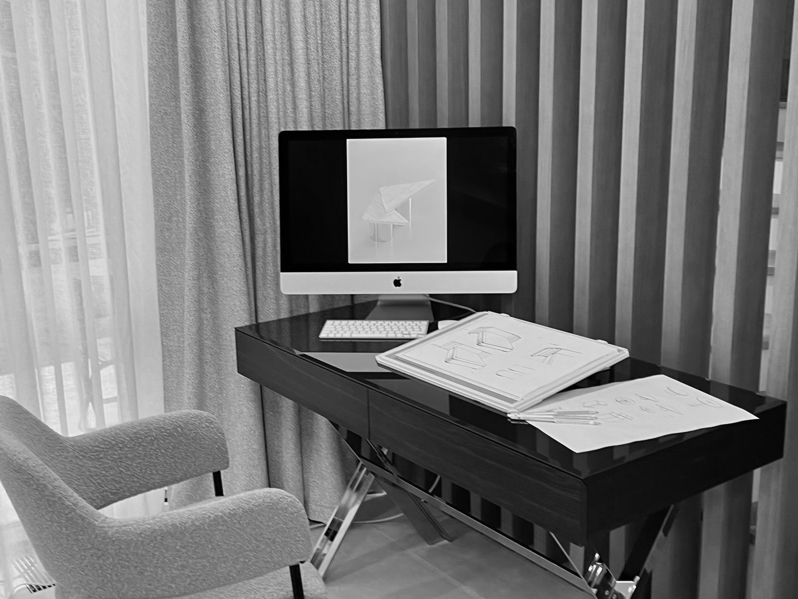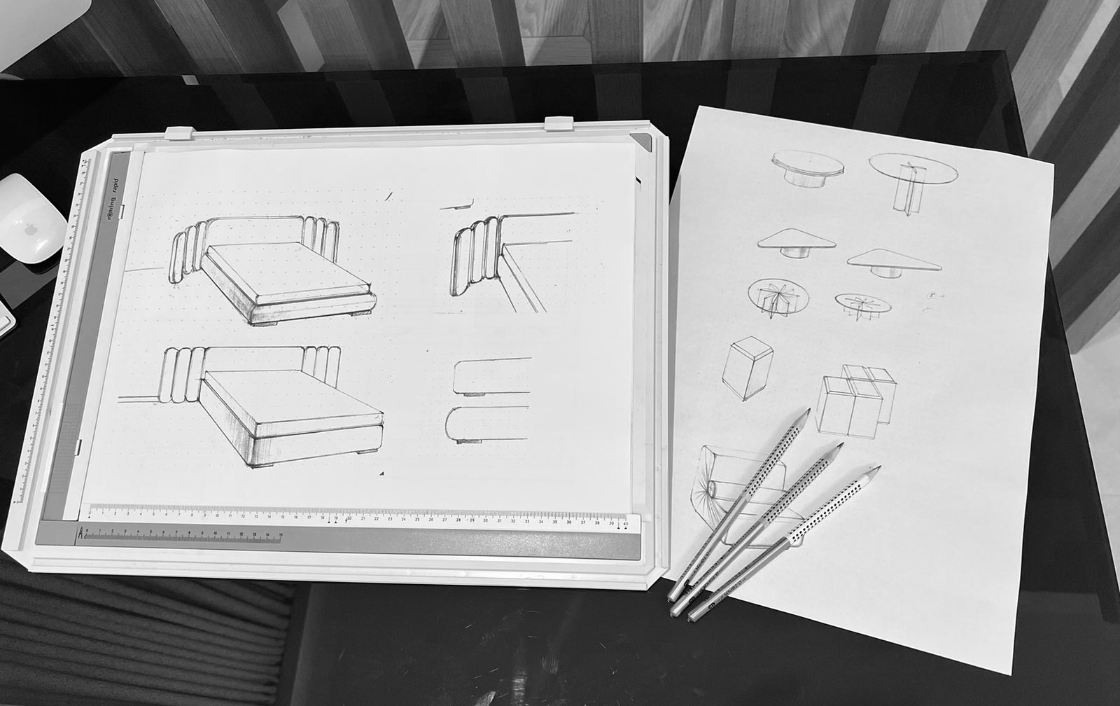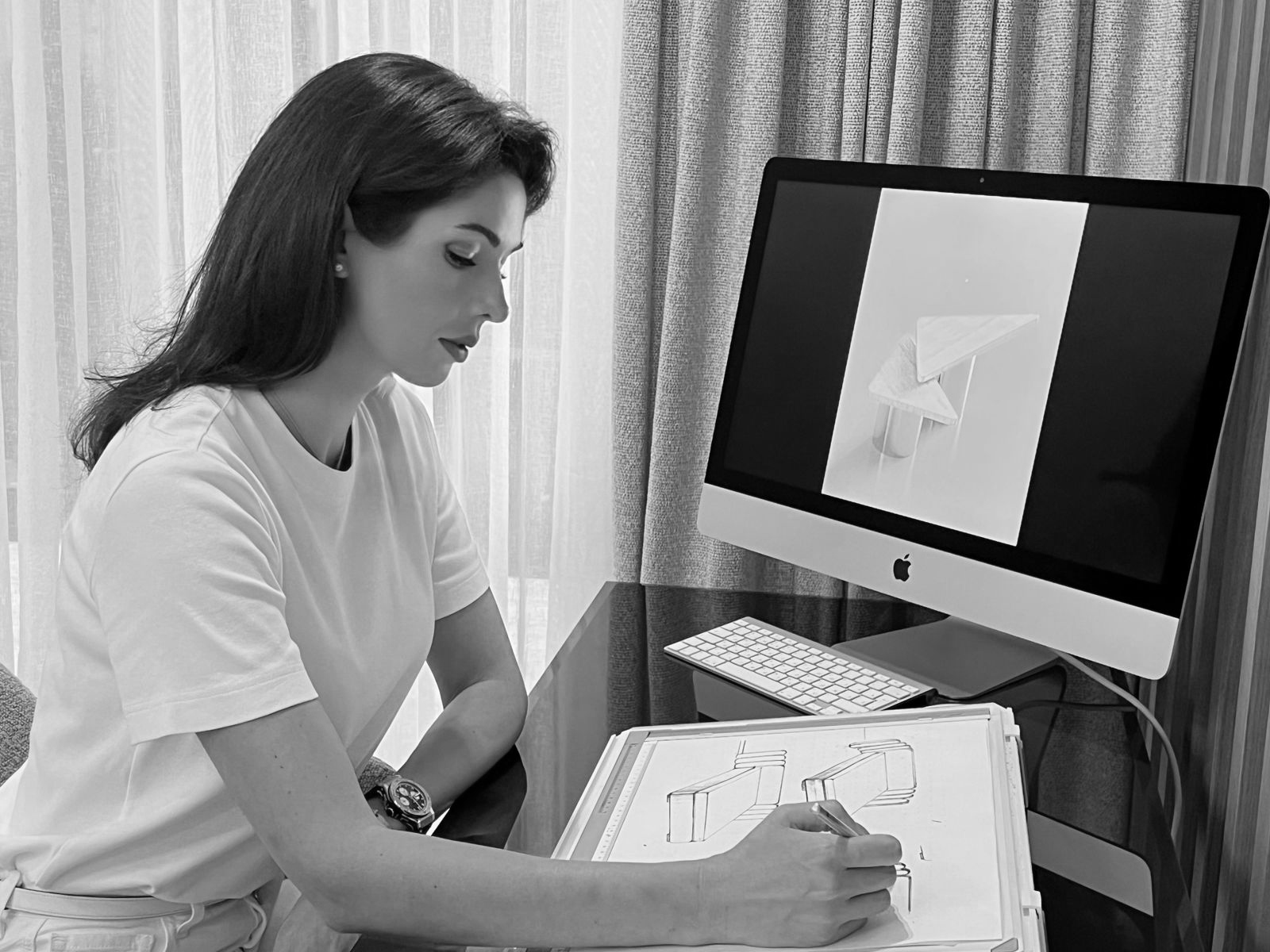 Главные рабочие инструменты дизайнера: карандаш, айпад и, конечно, телефон - в нем корректируются чертежи. Планировки Яна делает самостоятельно, видимо, говорит наследственная конструкторская жилка. “В юности я сама конструировала одежду. Сделать хорошую выкройку для брюк то же самое, что спроектировать конструктив дивана. В этом нет ничего сложного, логика та же”.