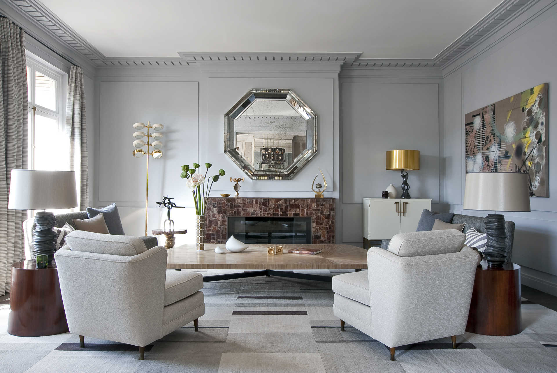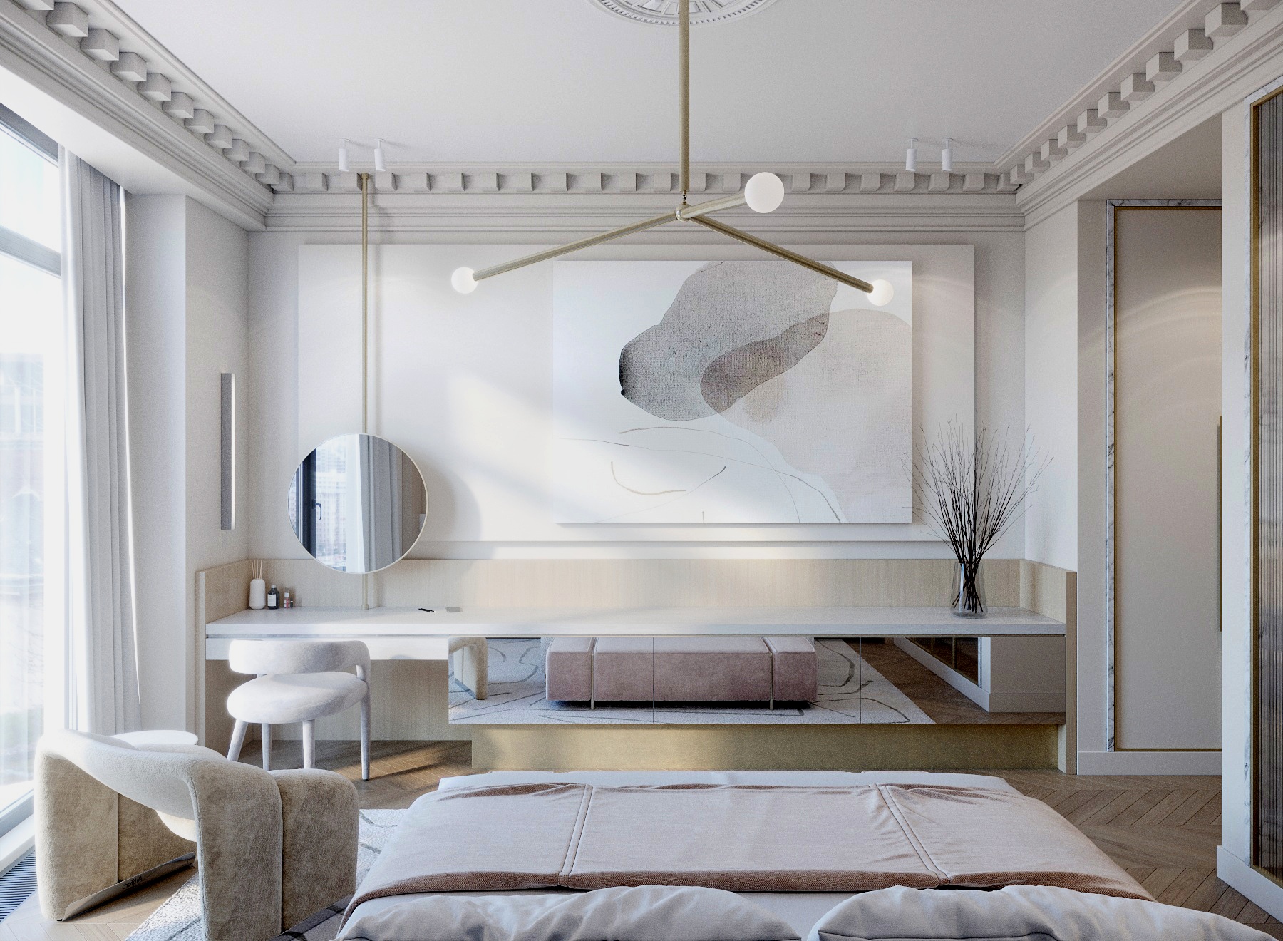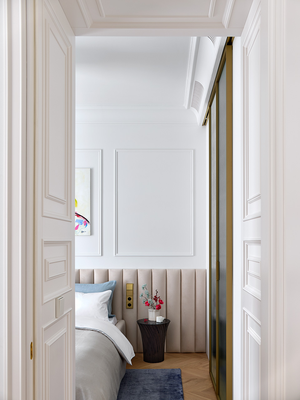 Тонкие профили настенных молдингов, латунные канты дверок и и ручки, графичные конструкции заключают этот воздушный интерьер в изящную раму.