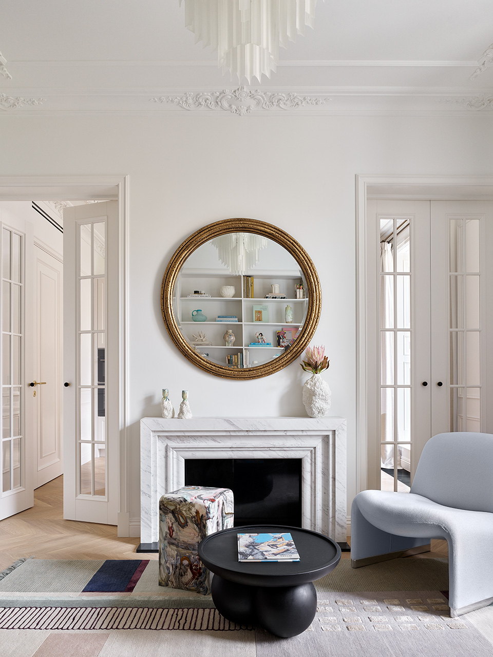 Благородные детали и материалы также отсылают к французскому стилю: паркет “елка”, мраморные пол и камин, гипсовая классическая лепнина.