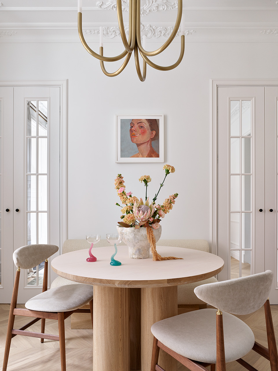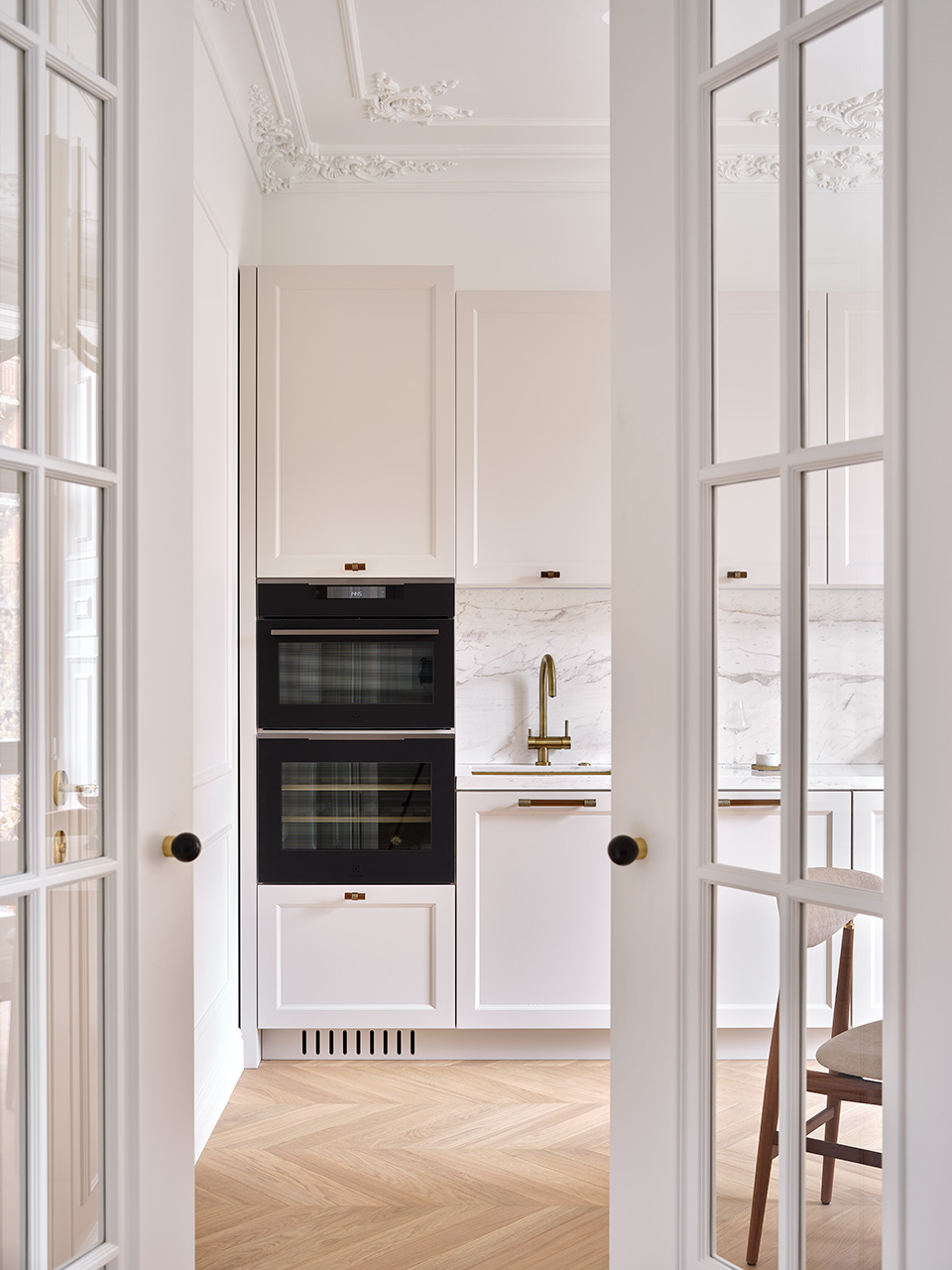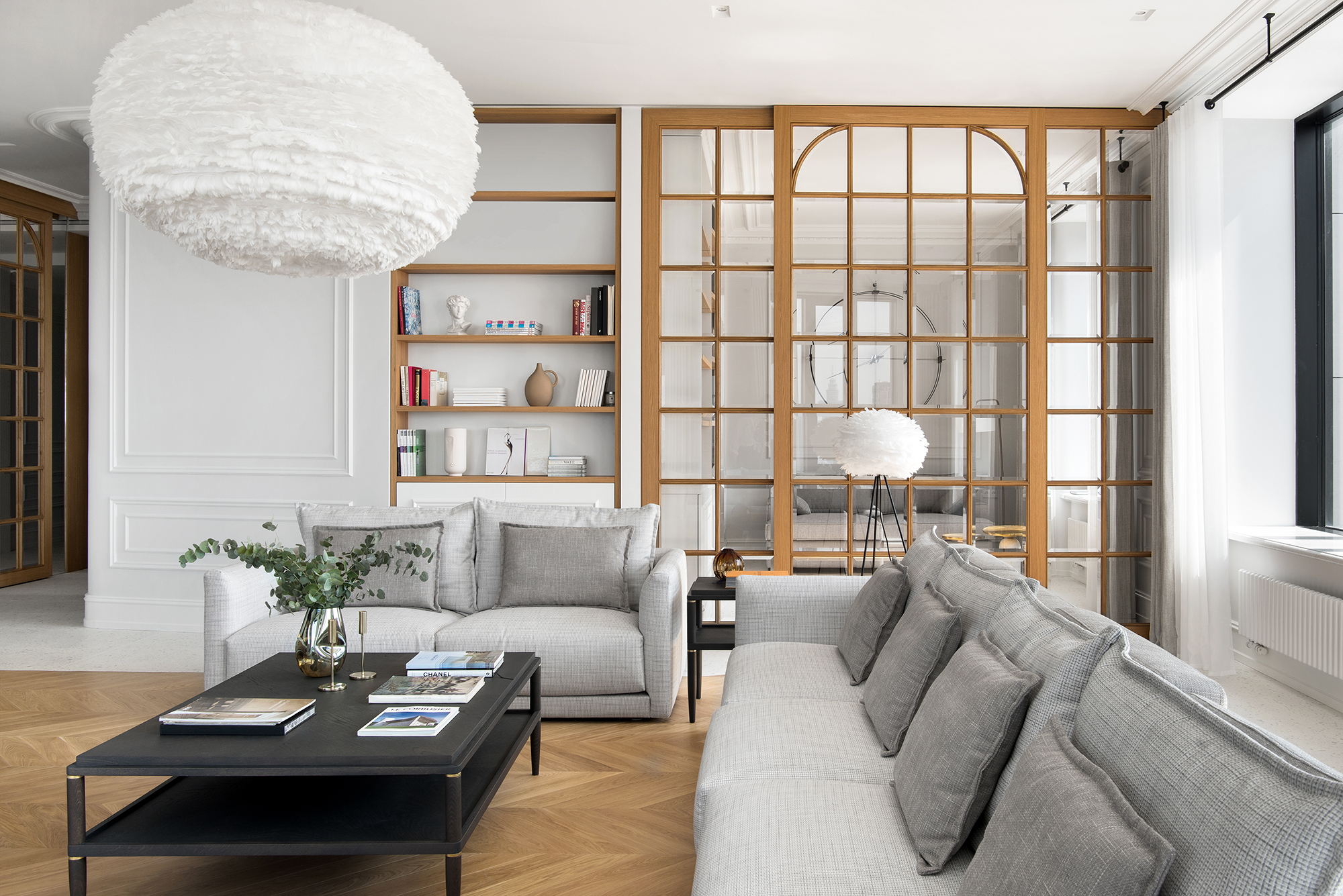 Квартира расположена в реконструированной сталинке, поэтому выбор стиля интерьера определялся архитектурой: современная история на классической базе с лёгким французским флером. В “османновских” квартирах легко представить подобную столярку: красивые распашные двери с узкими створками делались на заказ, они разделяют кухню и гостиную, но за счёт стекла сохраняют визуальное единство.