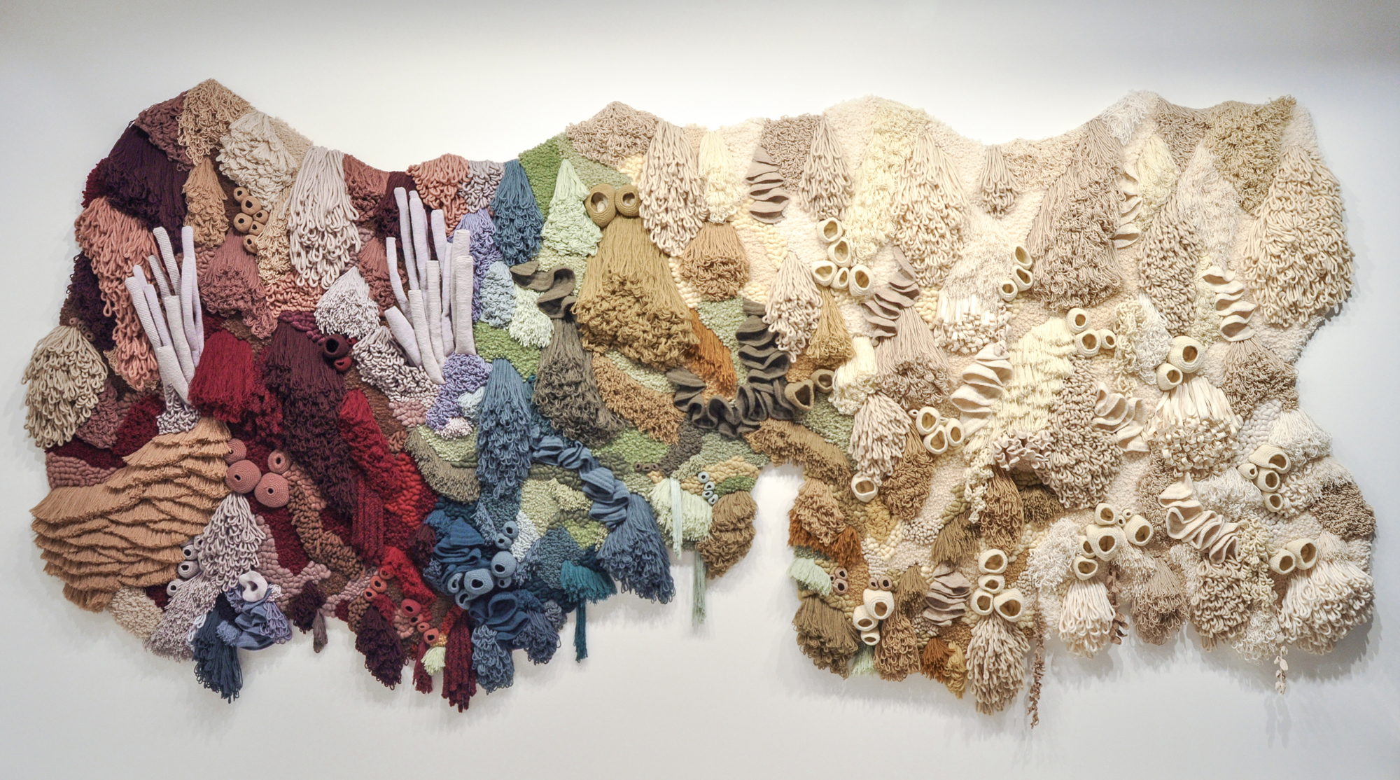 Ванесса Барраган для изготовления фактурных, объемных гобеленов использует исключительно переработанную пряжу. Ковры создает вручную, миксуя в одном изделии самые разные старинные техники - ткачество, вышивку, макраме, вязание крючком, фелтинг.
