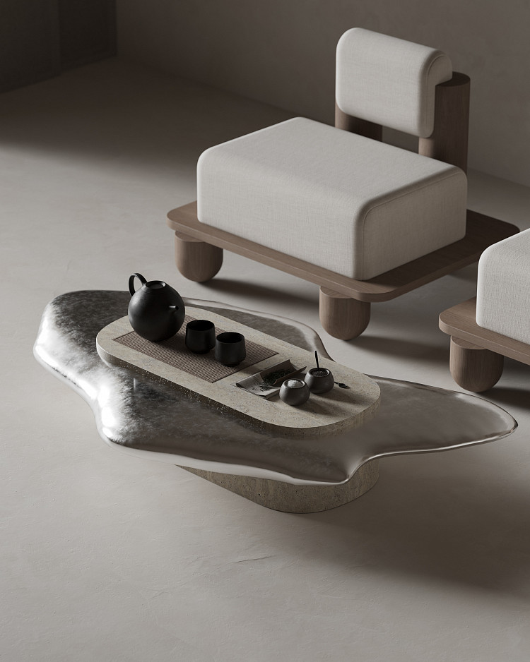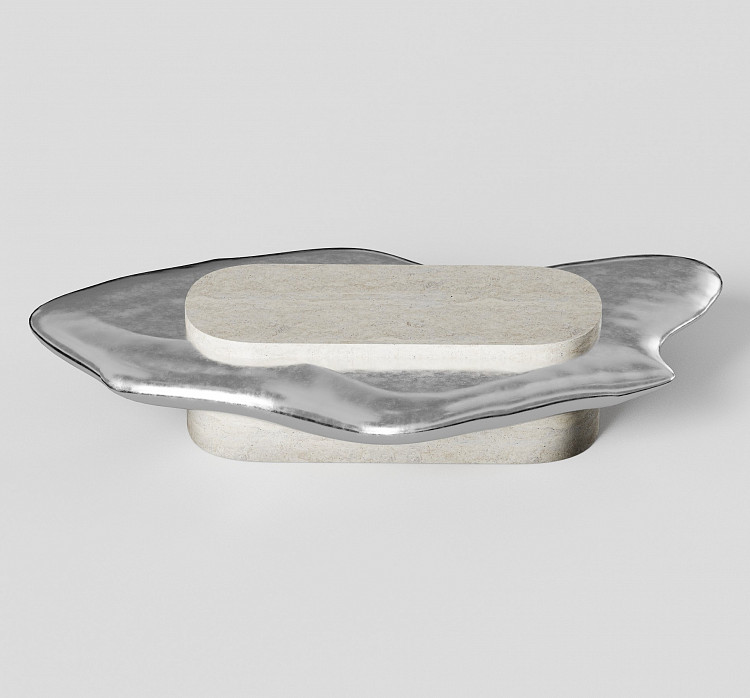 CHAI LOUNGE TABLE - журнальный стол по дизайну Маши Меренчуковой, от которого невозможно оторвать взгляд. Провокация и вызов скучной реальности: кажется, что столешница, словно расплавленный металл, разрезала на две части каменное основание из дербентского ракушечника и застыла в воздухе.