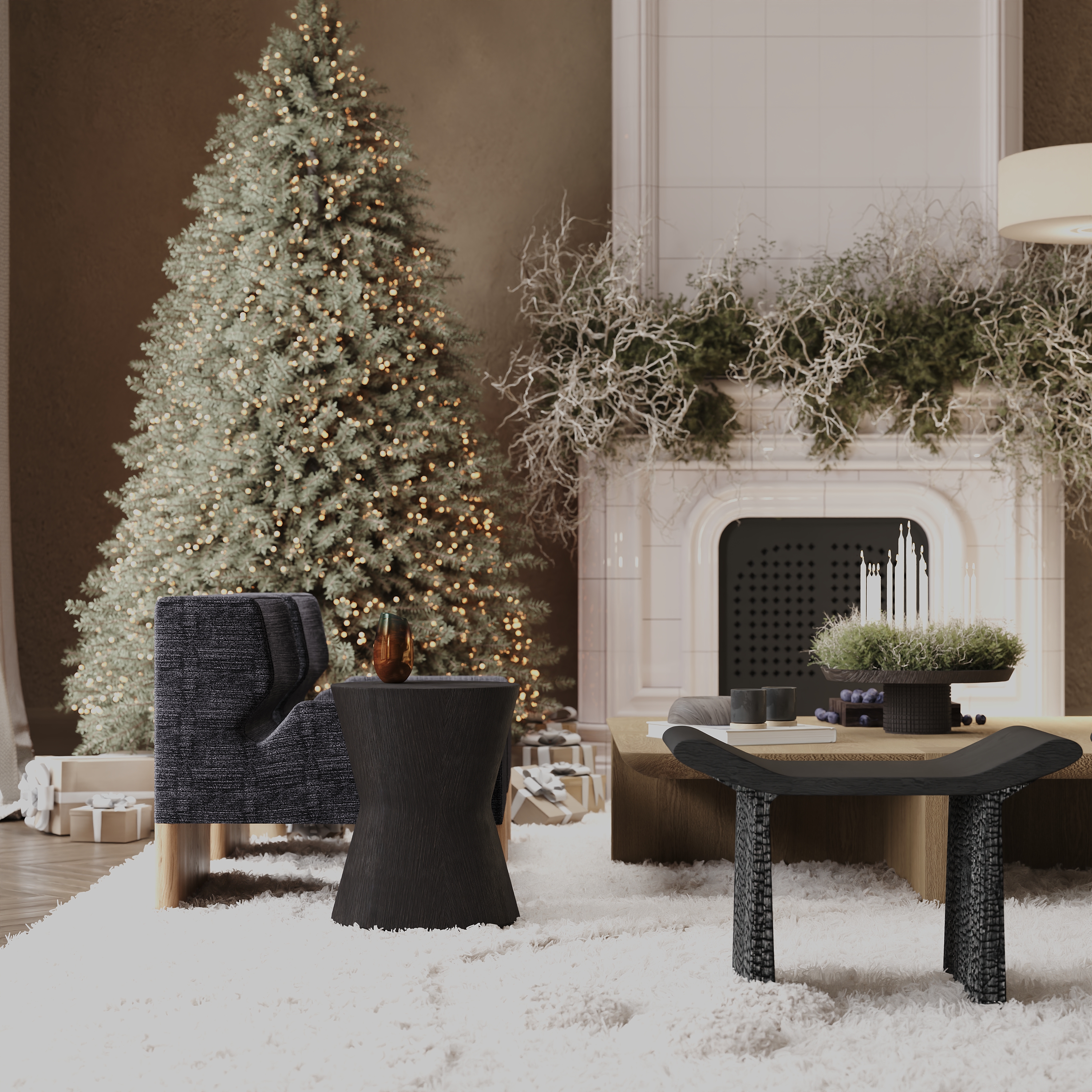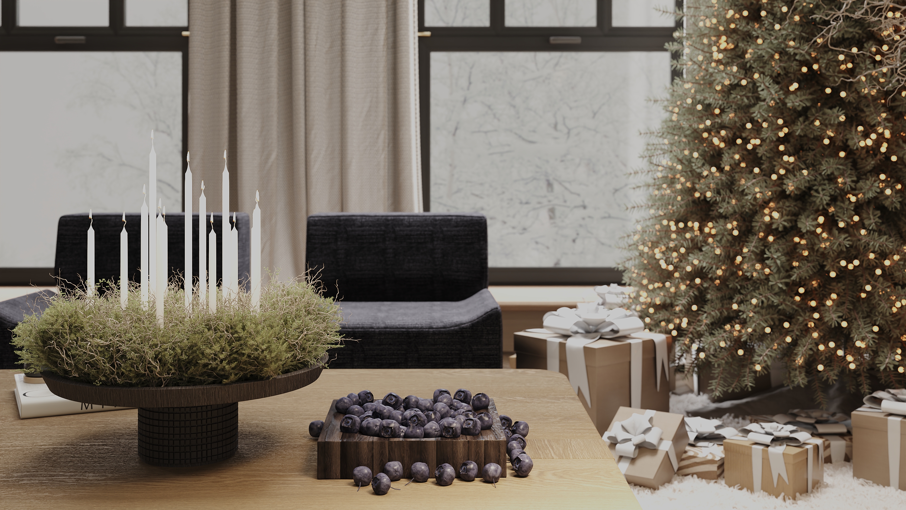 AGOJI CANDLESTICK. Ну какой новогодний праздник без подсвечника?! Мы выбрали несколько вариантов, придуманных Ольгой Погореловой. На журнальном столе - основательный, с подставкой диаметром целых 43 сантиметра, который одновременно может стать блюдом для фруктов. А на обеденном - более миниатюрные, высокие, с украшением из еловых веток. Все подсвечники совершенно удивительно смотрятся при зажженных свечах - появляется объем, проявляется фактура сложной резьбы по дереву авторства Ростислава Рубцова. Но и без них они выразительные, самодостаточные, графичные, свеча здесь - лишь дополнительный, деликатный компаньон, который не перетягивает на себя внимания.