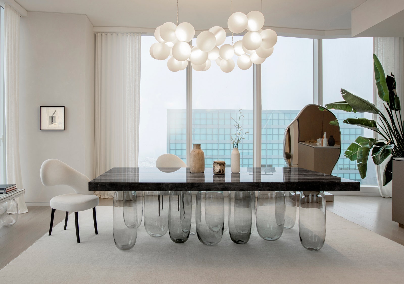 Стол по дизайну Матье Леаннера с мраморной столешницей и ножками из выдувного стекла.