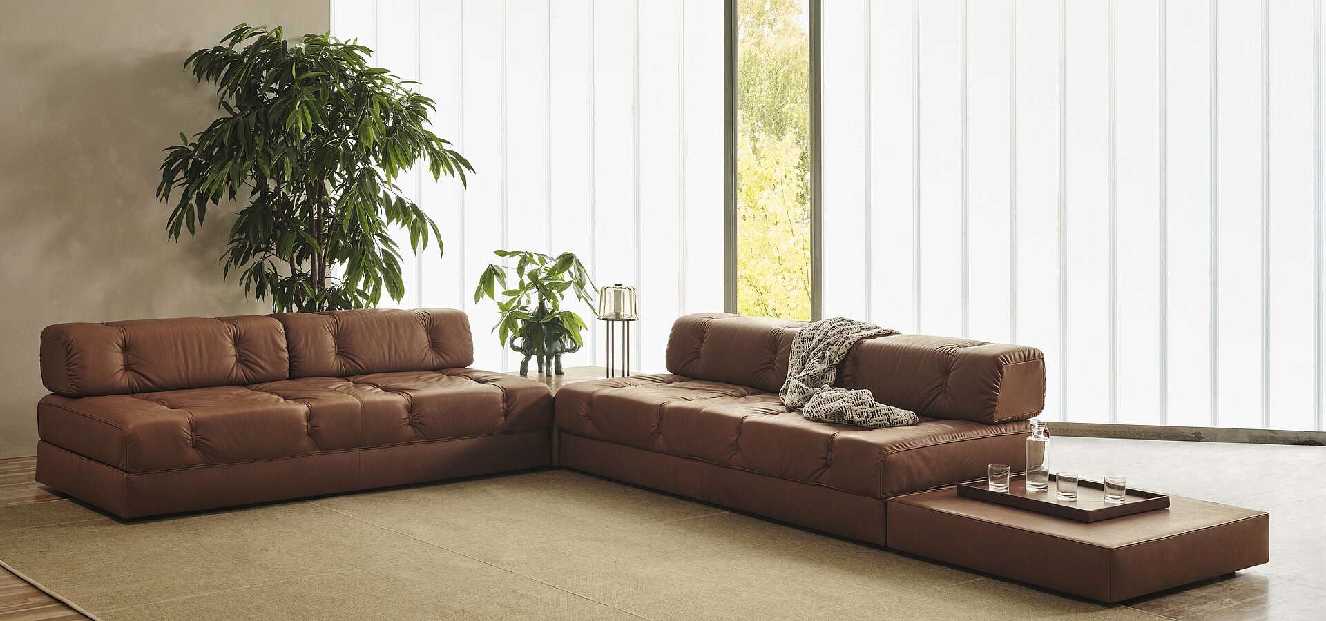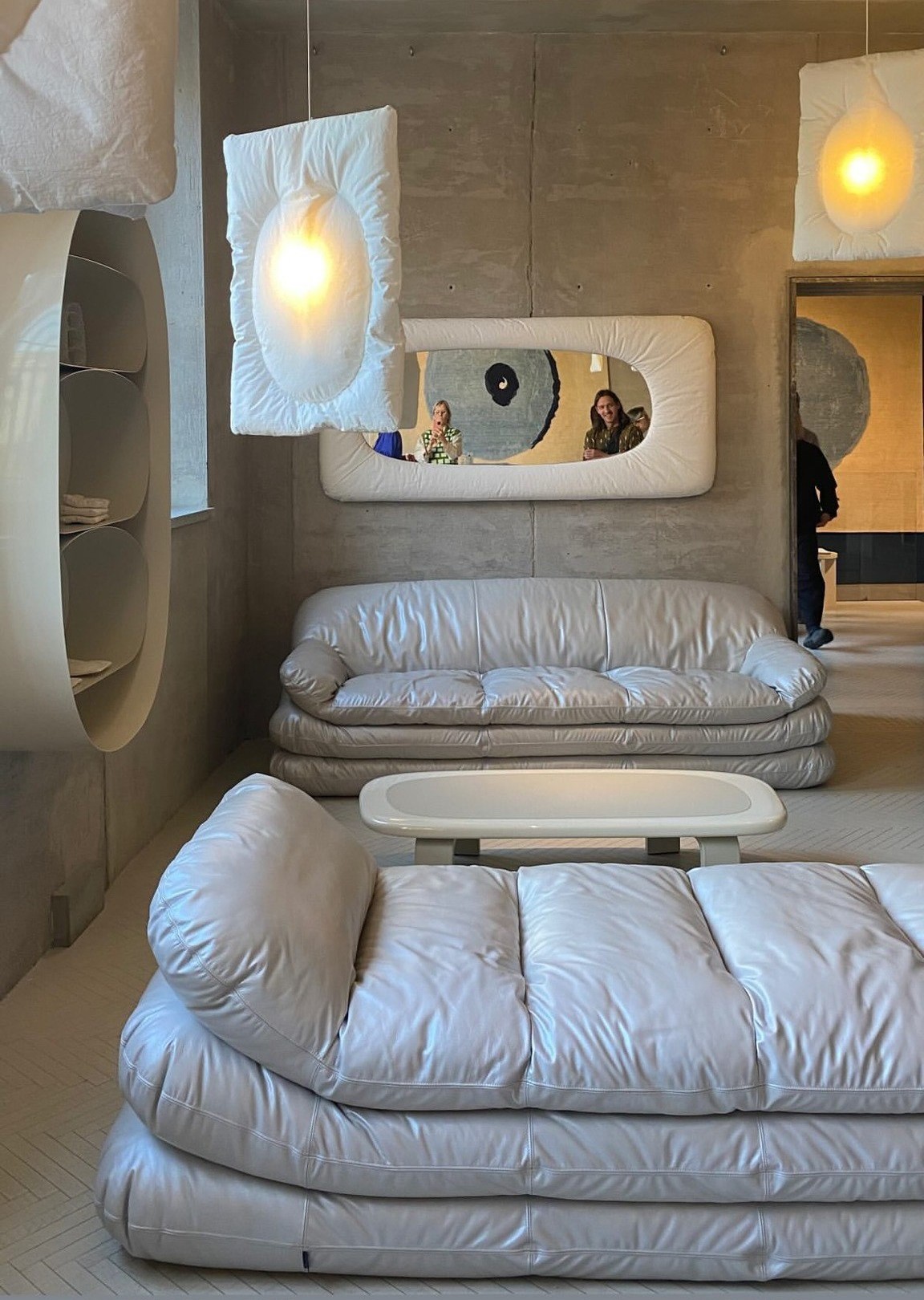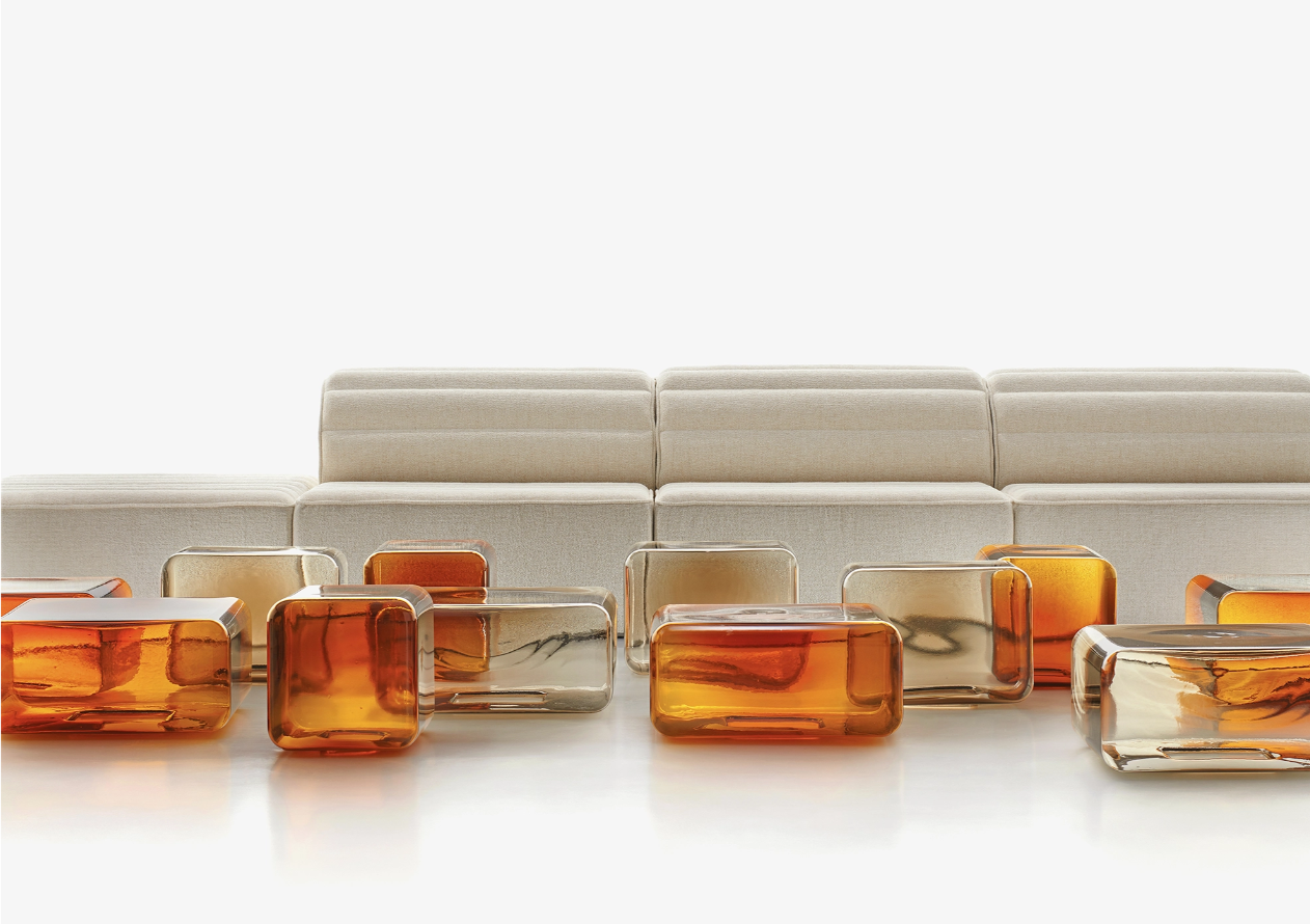 Столики из выдувного стекла Lokum от Сабины Марселиз на фоне переиздания дивана-татами Free System Клаудио Салокки (1973), Acerbis
