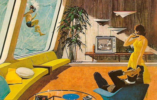 Характерные акценты: светильники космического вида. Самый известный – это модель «Спутник». Приветствуются лаконичные аксессуары, например, часы, как в фильме «Белорусский вокзал», керамика, цветные вазы простых форм. Добавляем на стену черно-белый портрет Хемингуэя свитере с горлом или фото родителей-шестидесятников, одетых по такой трогательной моде 50-х – атмосфера создана!