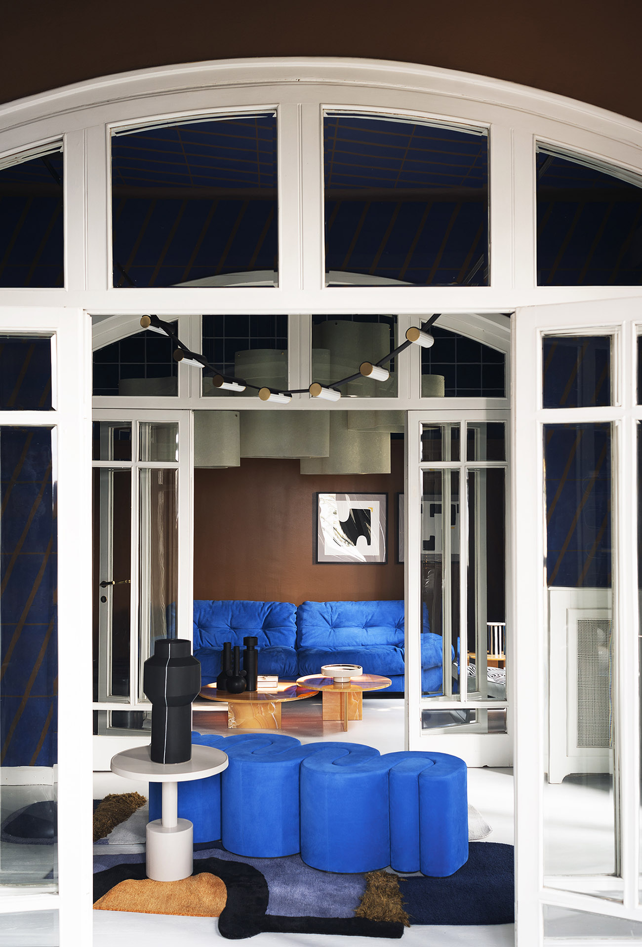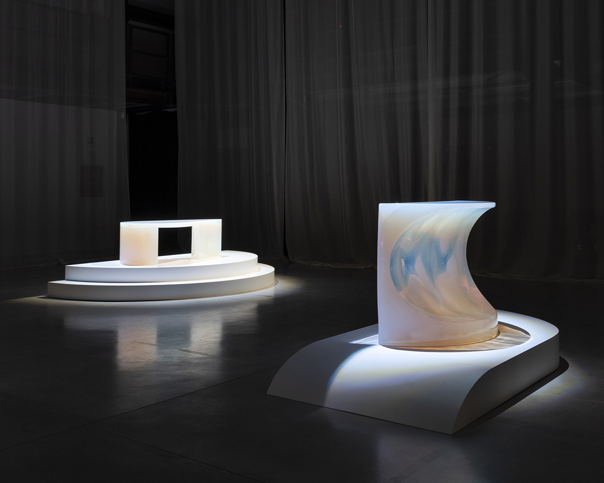 Экспозиция “The Bright Side of Design” - “Светлая сторона дизайна”. В темном пространстве на подсвеченных подиумах выставлены предметы мебели и аксессуары из полупрозрачной смолы. Так выглядят исследования Нины Яшар (основательницы Nilufar Gallery) и студии Objects of Common Interest на тему материала, света и их магического взаимодействия.
