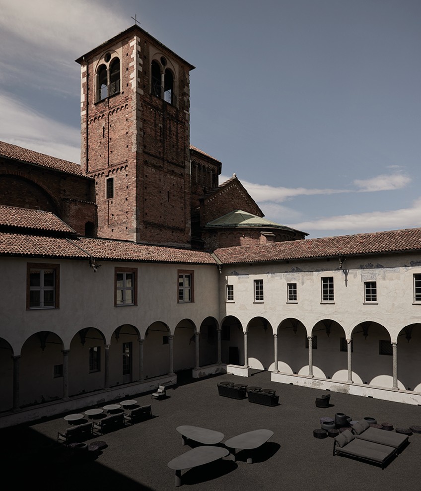 Очевидцы утверждают, что это была одна из самых незабываемых локаций. Для презентации своей первой outdoor-коллекции итальянский бренд выбрал клуатр монастыря XV века San Simpliciano, засыпал двор мелким черным вулканическим камнем, включил медитативную симфонию, специально написанную Катериной Барбьери, и наполнил пространство ароматов свечей… Инсталляция называлась “Perceptions: between nature and matter” (“Восприятия: между природой и материей”). Предполагалось, что зрители должны здесь замедлиться и прислушаться к своим чувствам. Многие так и делали, и покидать монастырь не спешили. Саму линейку проектировали Жан-Мари Массо, Эммануэль Галлина, Марсель Вандерс, Су Чан.