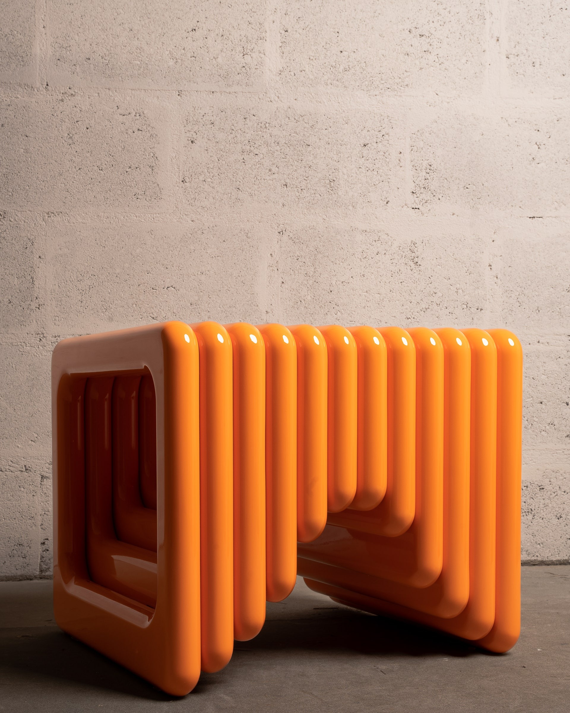 В той же гамме, ослепительно огненный, но в стиле 70-х, и этот табурет-столик, сложенный из разнородных кусков дерева. Форма покрыта несколькими слоями цветного лака, и лак явно будет в тренде. Дизайн: Фабьен Коломин.