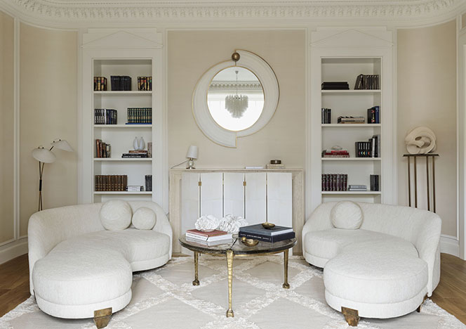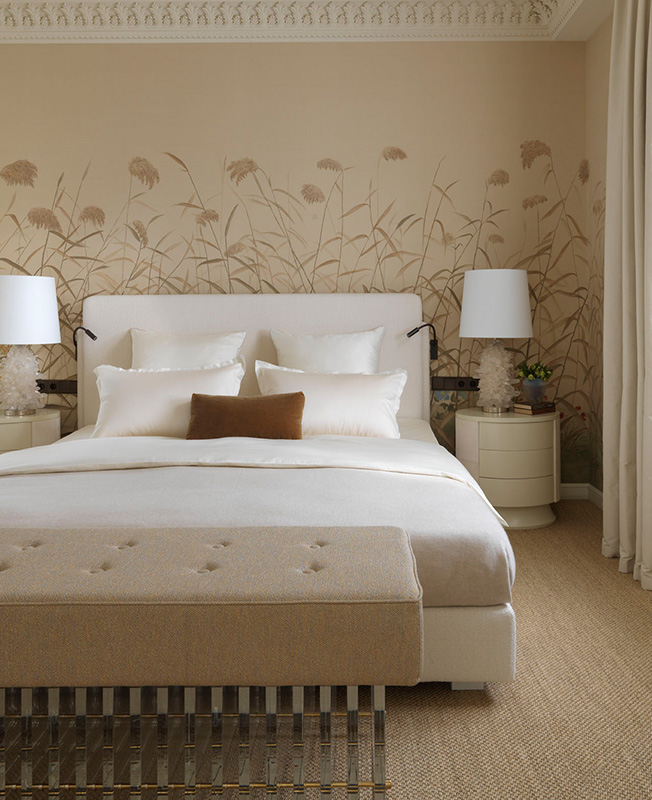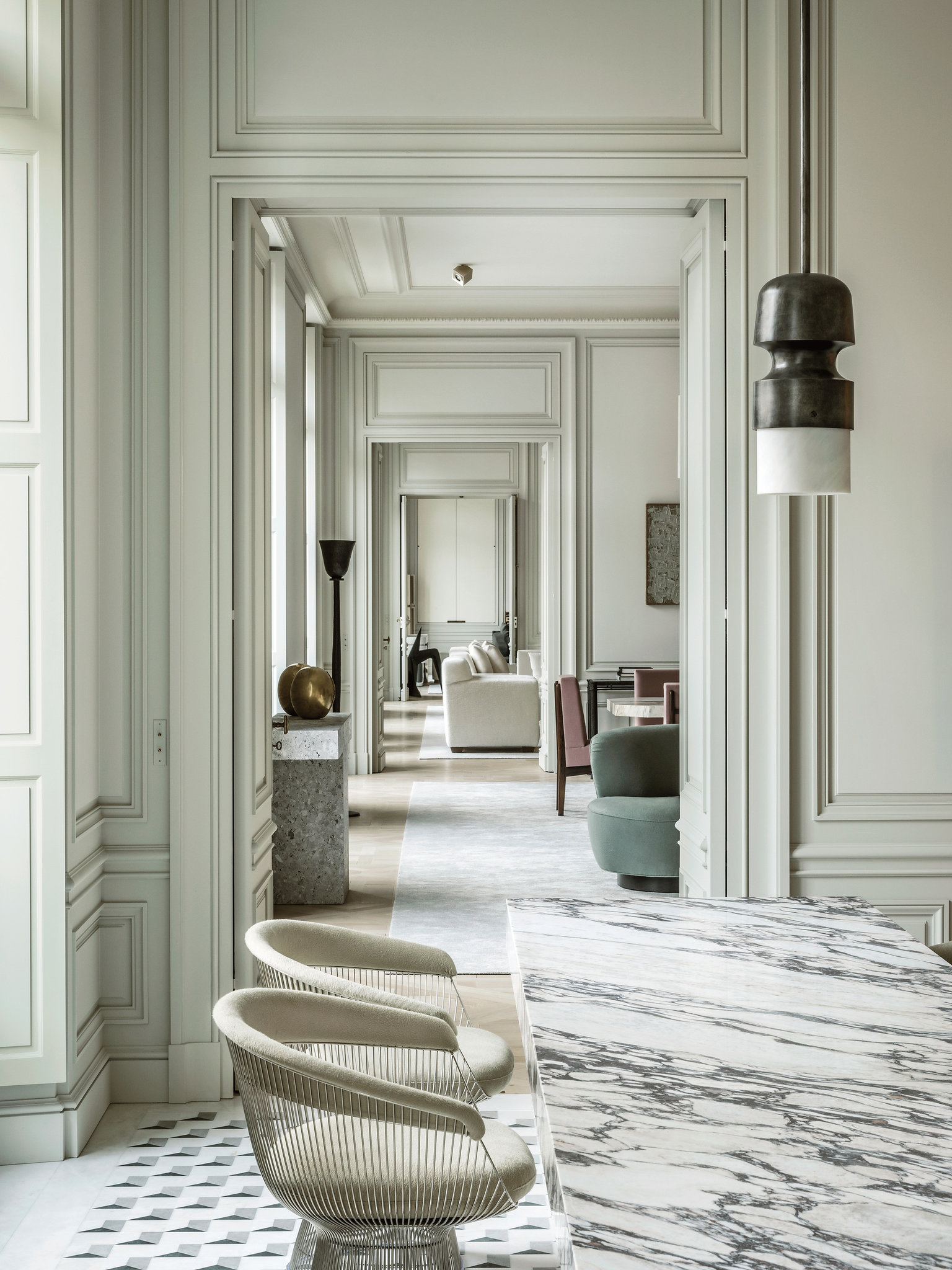 Любовь к белому цвету у Modenature наследственная. Светлая палитра off-white – это основа декора традиционных парижских квартир в домах периода барона Османа. В этих интерьерах никогда не будет резкого контраста: даже плитка при входе в черно-белую шашечку на самом деле не черно-белая, это всегда какой-нибудь сливочный оттенок для белого цвета и графит для черного. Точно так же на тонких нюансах работают французские декораторы, оформляя основные комнаты, делая раскреповку стен, буазери, высокие светлые плинтуса и дессюдепорты. Мягкая мебель в таком интерьере тоже, скорее всего, будет светлого оттенка – на контрасте с темными элементами ковки, рамами картин, бронзовыми аксессуарами и светильниками.